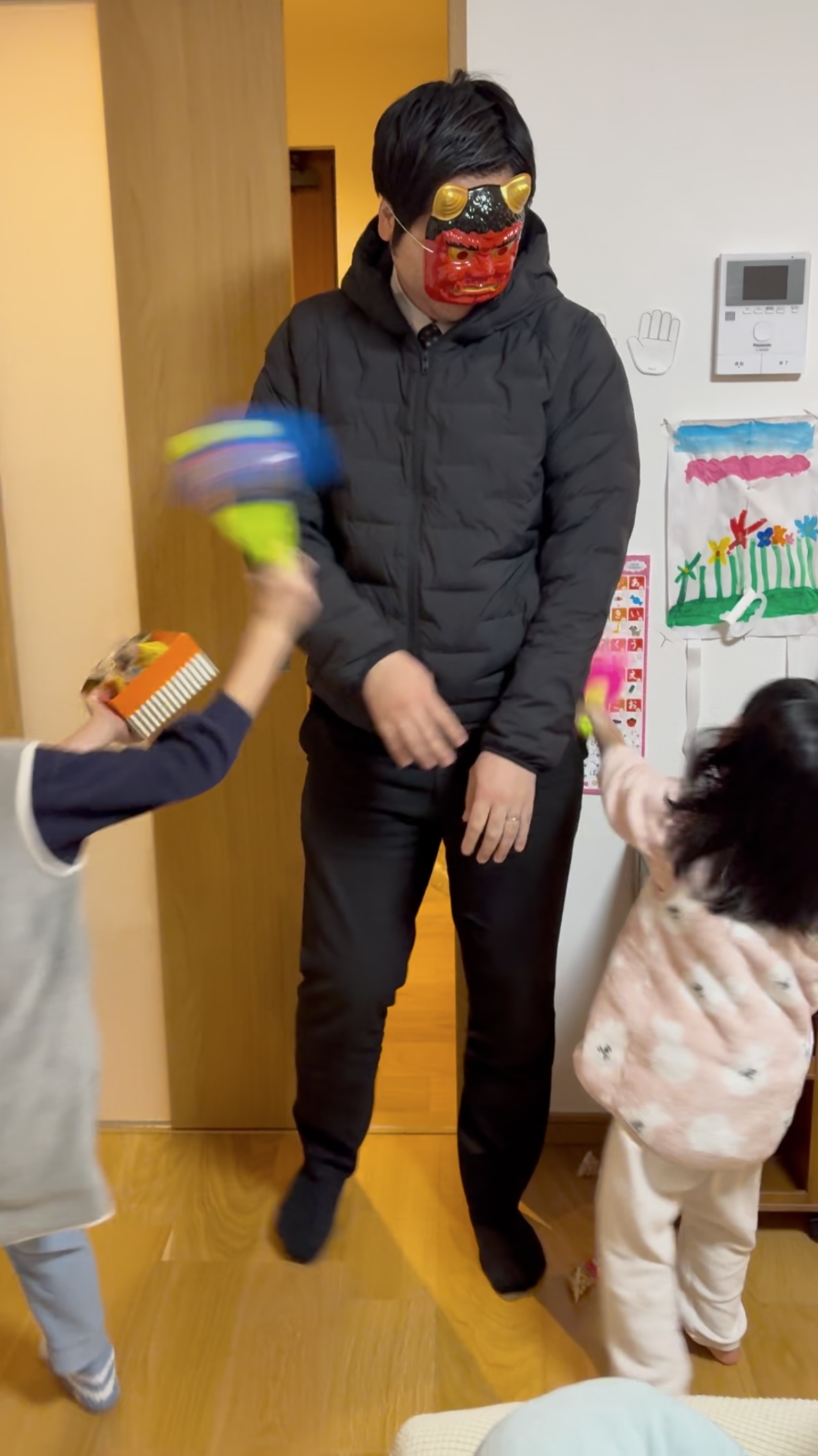 子どもたちが小袋の豆を投げたりピコピコハンマーで叩いたりして頑張って鬼退治をしていたので本当に痛かったそうです![]()