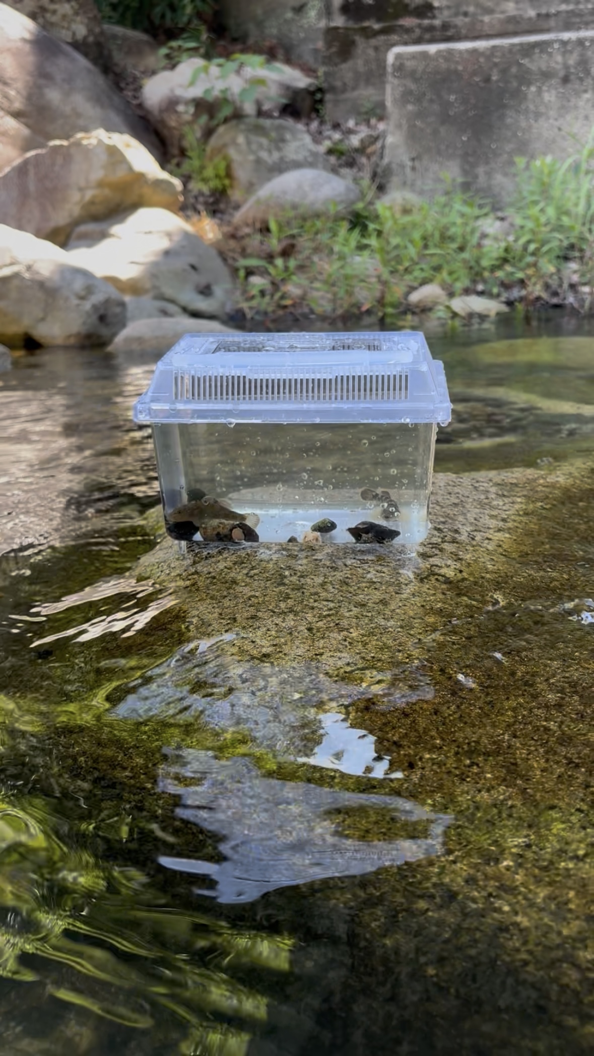 現地調達した網と虫かごと箱めがねで、夫は子どもと一緒にタニシや魚を捕まえていましたが、最終的には子どもより夢中になって虫かごをタニシでいっぱいにしていました笑