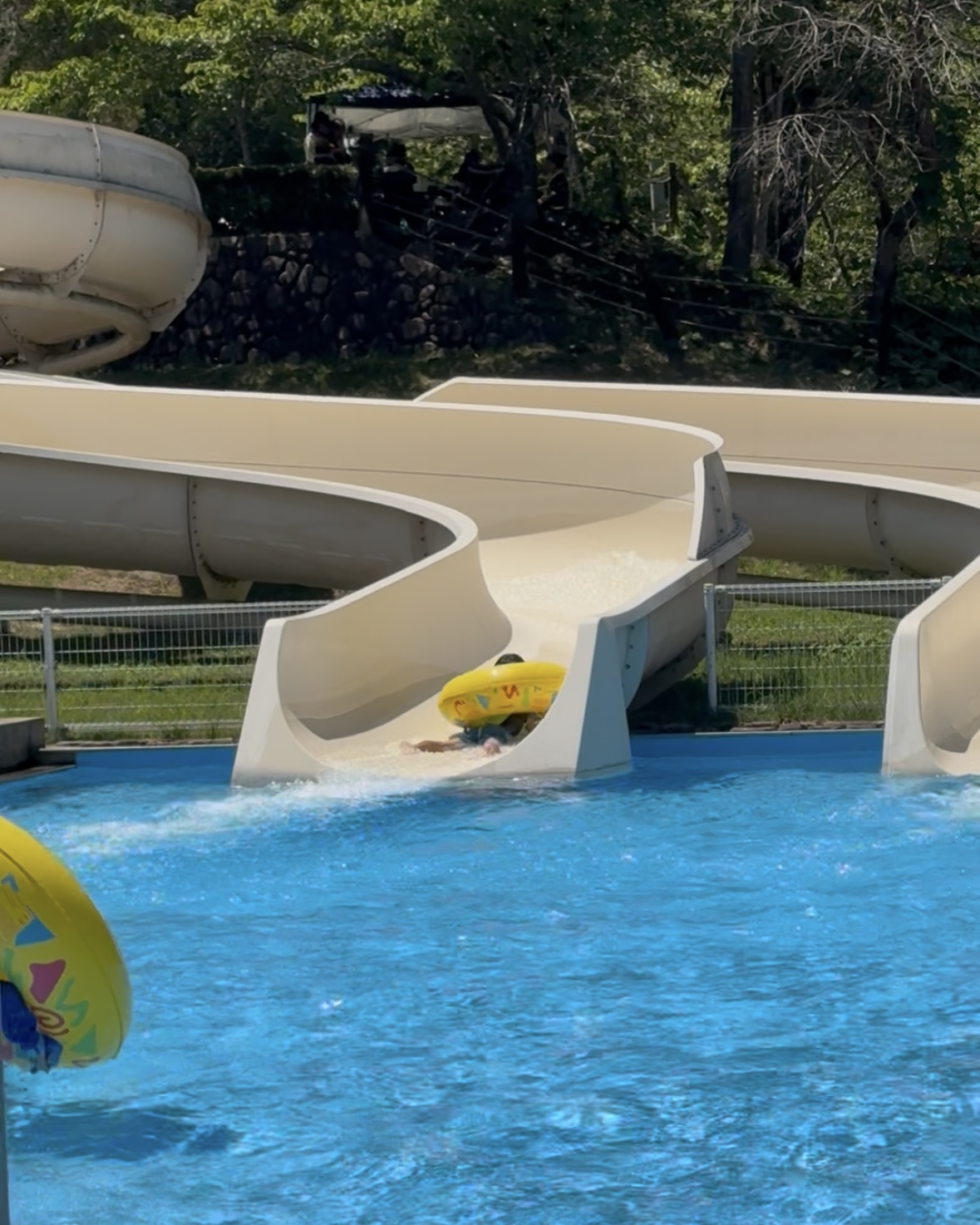 川のすぐ隣にウォータースライダーもあり、120㎝以上の身長制限があり下の子はできませんでしたが、上の子は楽しく滑っていましたが、2回目に滑る途中のカーブで浮き輪がひっくり返り浮き輪の下敷きになりプールにインしたので溺れそうになり涙が出て、それ以降は乗りませんでした