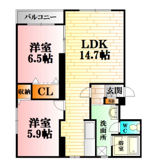 | 築年月 | 2001年1月 | 間取り | 2LDK( 洋室5.9畳/洋室6.5畳/LDK14.7畳 ) | 専有面積 | 58.4m2 |