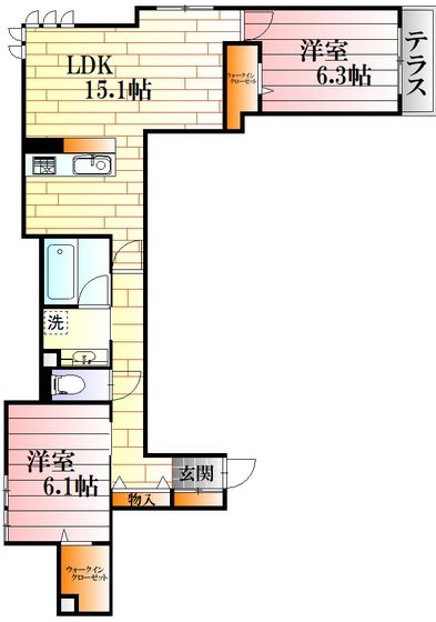 | 築年月 | 2019年9月 | 間取り | 2LDK( LDK15.1畳/洋室6.3畳/洋室6.1畳 ) | 専有面積 | 65.55m2 |