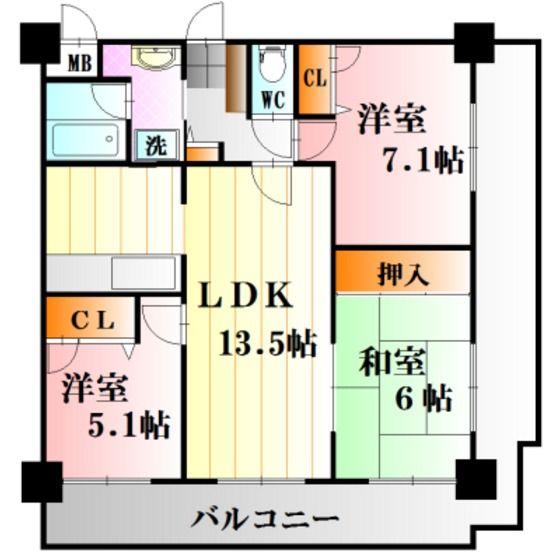 | 築年月 | 2002年1月 | 間取り | 3LDK( LDK13.5畳/洋室7.1畳/洋室5.1畳/和室6畳 ) | 専有面積 | 68.55m2 |
