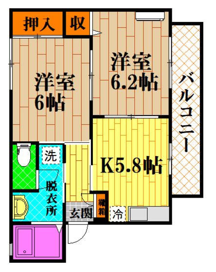| 築年月 | 1994年9月 | 間取り | 2K( K5.8畳/洋室6.2畳/洋室6畳 ) | 専有面積 | 42.66m2 |