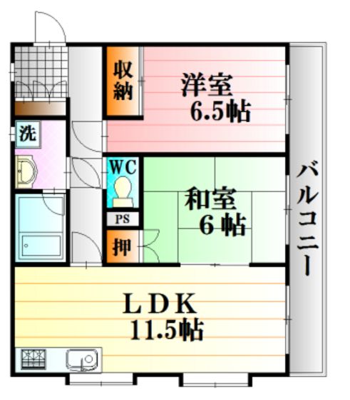 | 築年月 | 1994年10月 | 間取り | 2LDK( LDK11.5畳/洋室6.5畳/和室6畳 ) | 専有面積 | 55.89m2 |