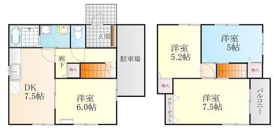 | 築年月 | 2004年3月 | 間取り | 4DK( DK7.5畳/洋室7.5畳/洋室6畳/洋室5.2畳/洋室5畳 ) | 専有面積 | 72.86m2 |