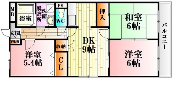 • 間取り:3DK(DK9畳/洋室5.4畳/洋室6.2畳/和室6畳) / 専有面積:62.27m2