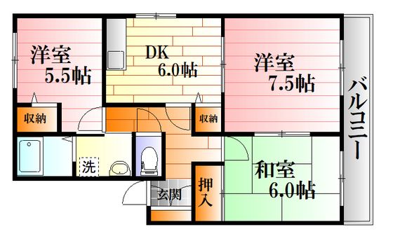 | 築年月 | 1994年6月 | 間取り | 3DK( DK6畳/洋室7.5畳/洋室5.5畳/和室6畳 ) | 専有面積 | 59m2 |