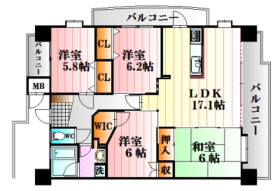 | 築年月 | 2003年3月 | 間取り | 4LDK( LDK17.1畳/和室6畳/洋室6畳/洋室6.2畳/洋室5.8畳 ) | 専有面積 | 91.16m2 |