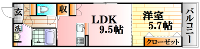 広々1LDK空間(LDK9.5帖・洋室5.7帖)で