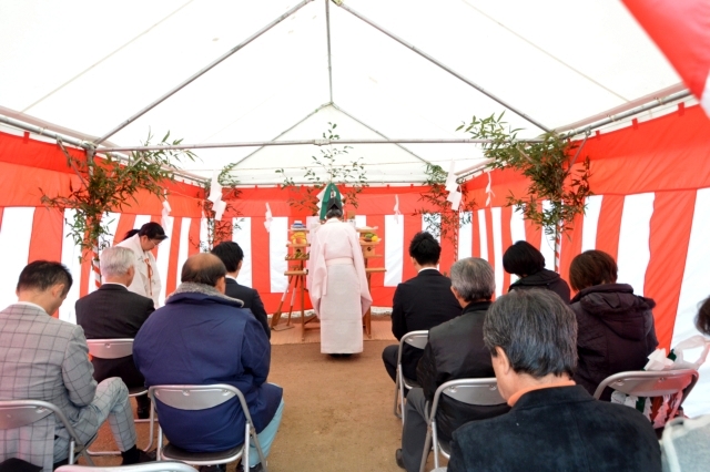 神様をお迎えし、お供え物を差し上げ、神様に奉告、工事の安全・家の繁栄を祈願します。