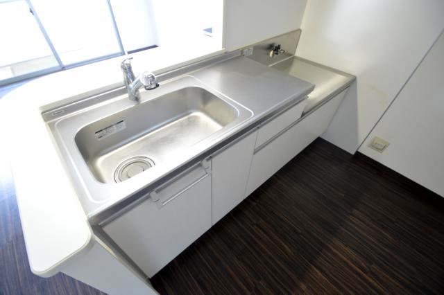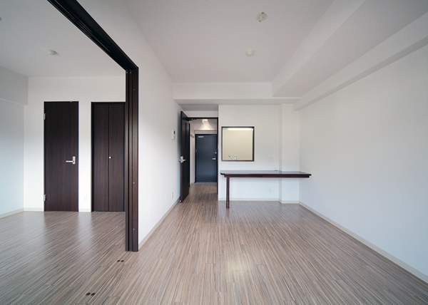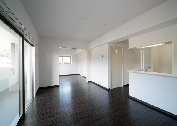 黒系のフローリン・建具に、白系のキッチンが高級感を演出