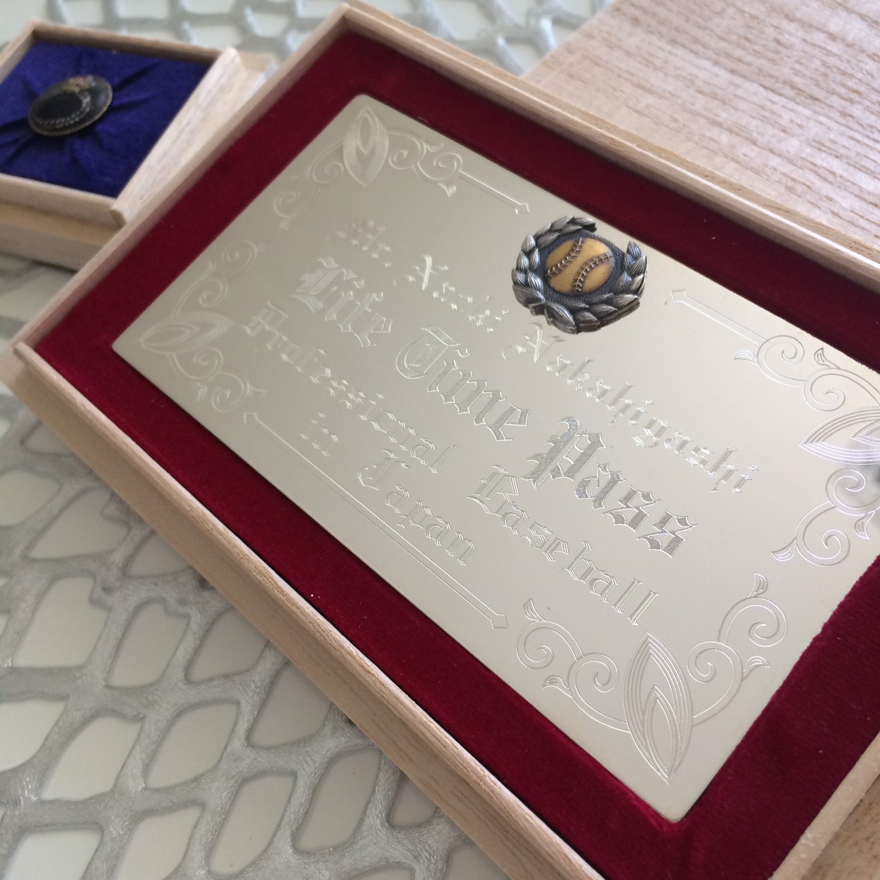 最後にこれはプロで10年選手をしたらもらえるプレートとバッチです