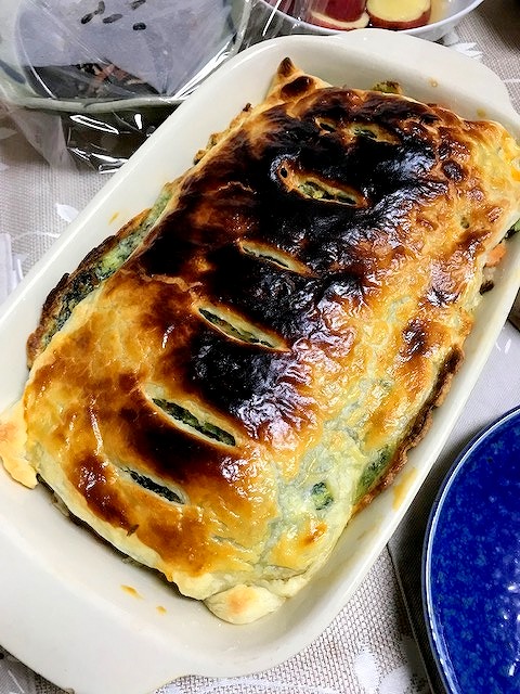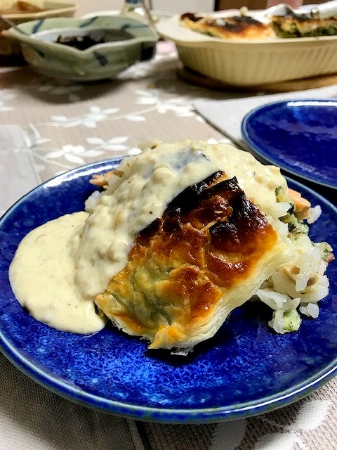 パイ生地で鮭とバターライスを包んで焼き上げるものですが