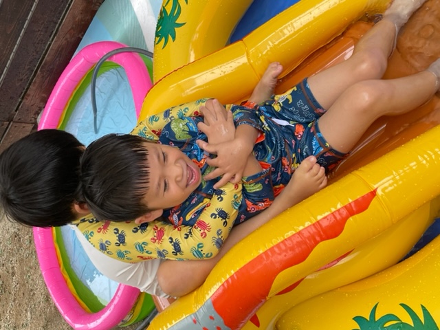 どこも行けないし、プールでもしようか、と自宅でプールをしてみたり・・
