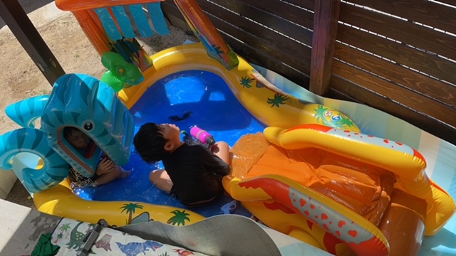 もういいや、ここで。と中途半端な位置に 雑ではありますが・・プールを設置しました![]()