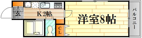 | 築年月 | 1997年6月 | 間取り | 1K( K2畳/洋室8畳 ) | 専有面積 | 26.5m2 |