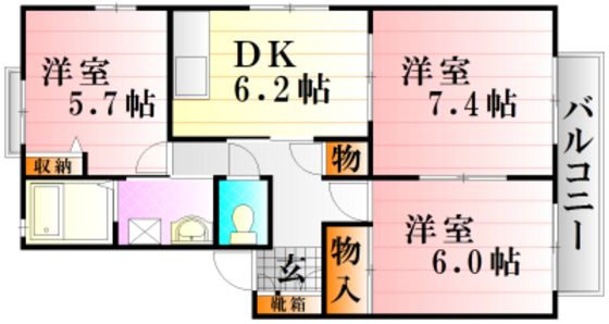 | 築年月 | 1996年7月 | 間取り | 3DK( DK6.2畳/洋室7.4畳/洋室6畳/洋室5.7畳 ) | 専有面積 | 59.69m2 |