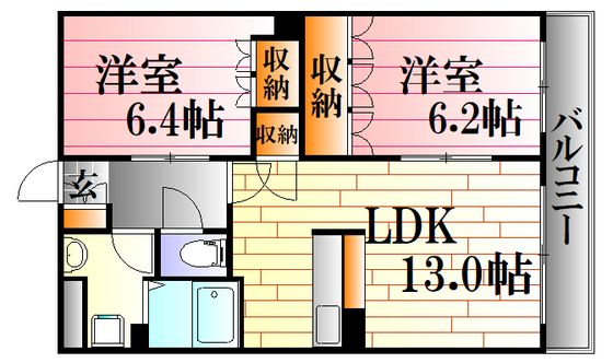 | 築年月 | 2004年12月 | 間取り | 2LDK( LDK13畳/洋室6.4畳/洋室6.2畳 ) | 専有面積 | 57.33m2 |