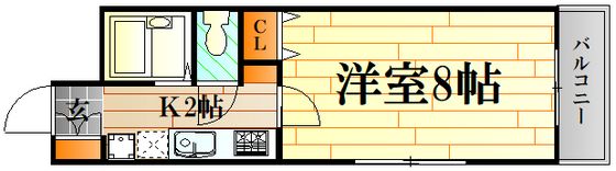 | 築年月 | 1997年6月 | 間取り | 1K( K2畳/洋室8畳 ) | 専有面積 | 26.5m2 |