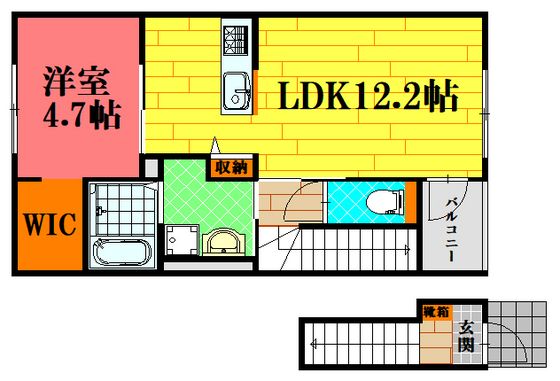 | 築年月 | 2021年2月 | 間取り | 1LDK( LDK12.2畳/洋室4.7畳 ) | 専有面積 | 47.98m2 |