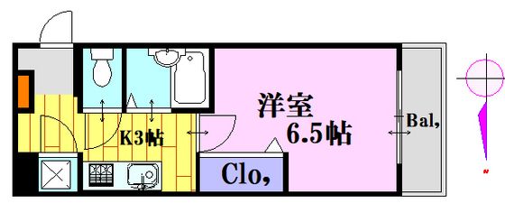 | 築年月 | 1998年5月 | 間取り | 1K( K3畳/洋室6.5畳 ) | 専有面積 | 22.65m2 |