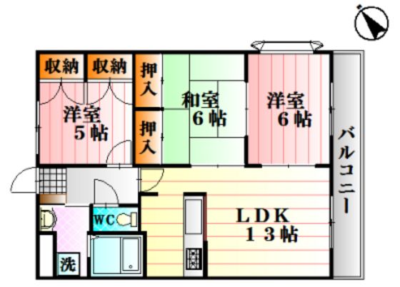 | 築年月 | 1999年9月 | 間取り | 3LDK( LDK13畳/洋室6畳/和室6畳/洋室5畳 ) | 専有面積 | 65.47m2 |