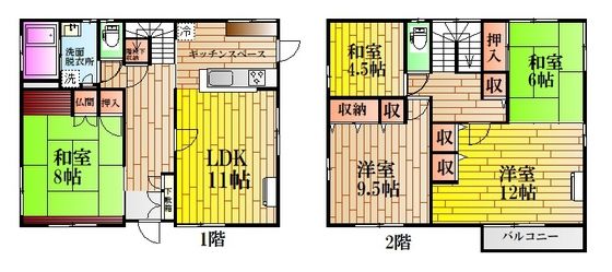 | 備 考 | 100u以上の広々な戸建!カーポート付き駐車場付♪人気の3口コンロ付きカウンターキッチン!収納箇所が計9箇所と荷物が多い方でも安心(^^洋室12帖、和室8帖、洋室9.5帖と家具の配置も色々と考えれます |