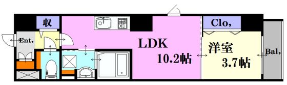 | 築年月 | 2018年10月 | 間取り | 1LDK( LDK10.2畳/洋室3.7畳 ) | 専有面積 | 37.35m2 |