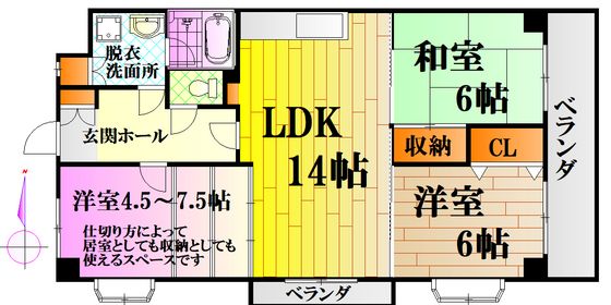 | 築年月 | 1989年7月 | 間取り | 3LDK( 洋室6畳/洋室6畳/和室6畳/LDK14畳 ) | 専有面積 | 74m2 |