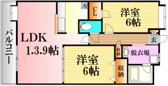 | 築年月 | 2005年10月 | 間取り | 2LDK( LDK13.9畳/洋室6畳/洋室6畳 ) | 専有面積 | 59.67m2 |