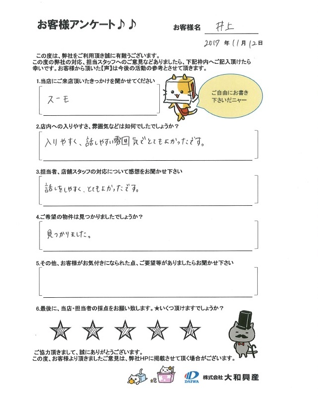 店内は入りやすくて話しやすい雰囲気があり、希望物件も見つかりました。