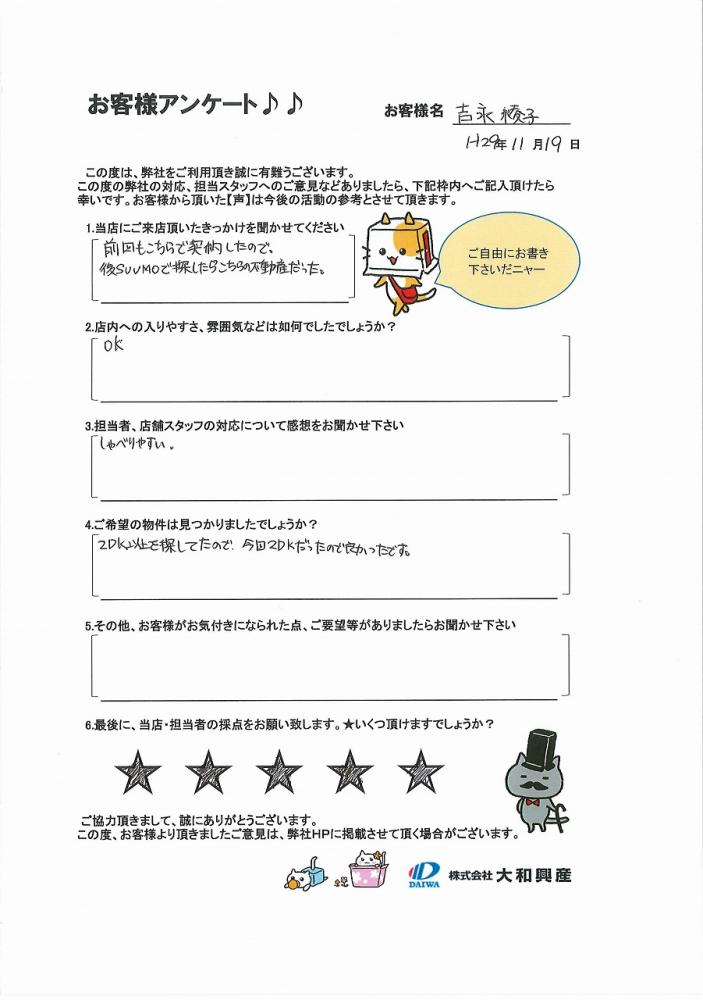 前回もこちらの不動産を利用しました。担当者(神原店長)もスタッフの方もしゃべりやすかったです。