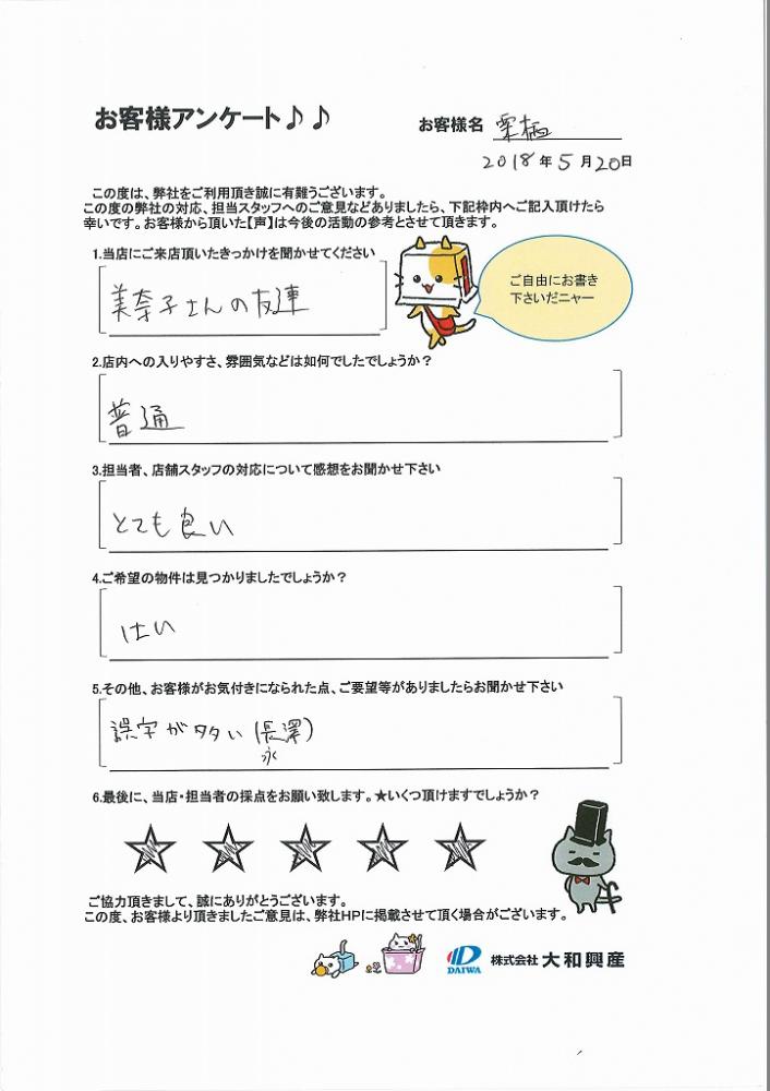 栗栖 様 この度は大和興産でご契約頂きありがとうございます!! 何件か見た中で気に入って頂ける物件が見つかって良かったです!! これからも仲の良いお二人で新婚生活を楽しんで下さい☆ 新居に遊びに行きますね♪♪